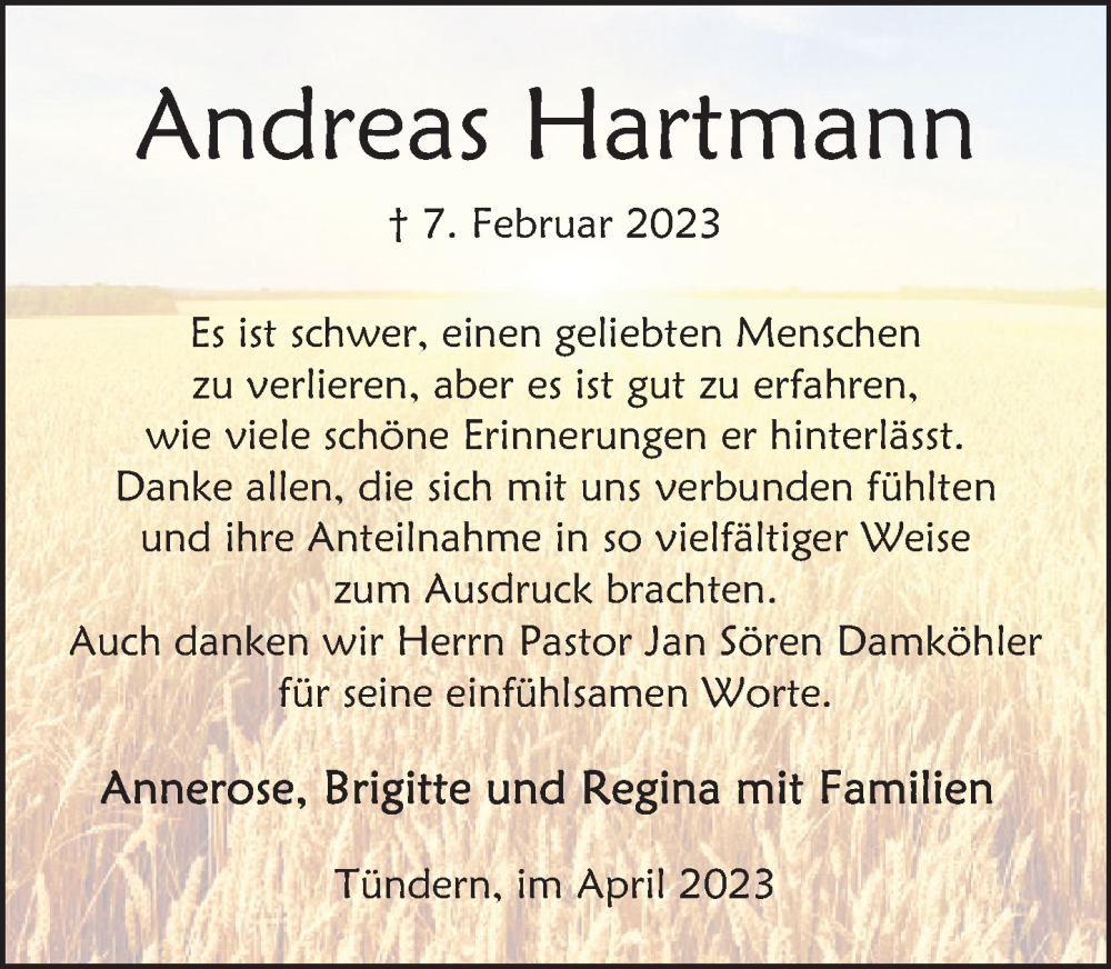 Hier finden Sie alle Traueranzeigen aus der Zeitung, die bisher für Andreas Hartmann erschienen sind. Weitere Traueranzeigen, die in der Zeitung erscheinen, werden hier ebenfalls aufgelistet
