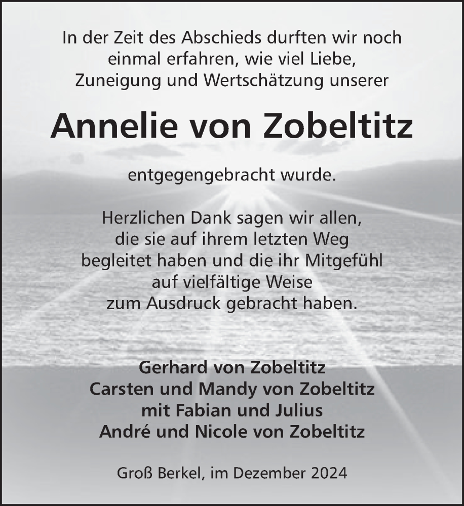 Hier finden Sie alle Traueranzeigen aus der Zeitung, die bisher für Annelie von Zobeltitz erschienen sind. Weitere Traueranzeigen, die in der Zeitung erscheinen, werden hier ebenfalls aufgelistet