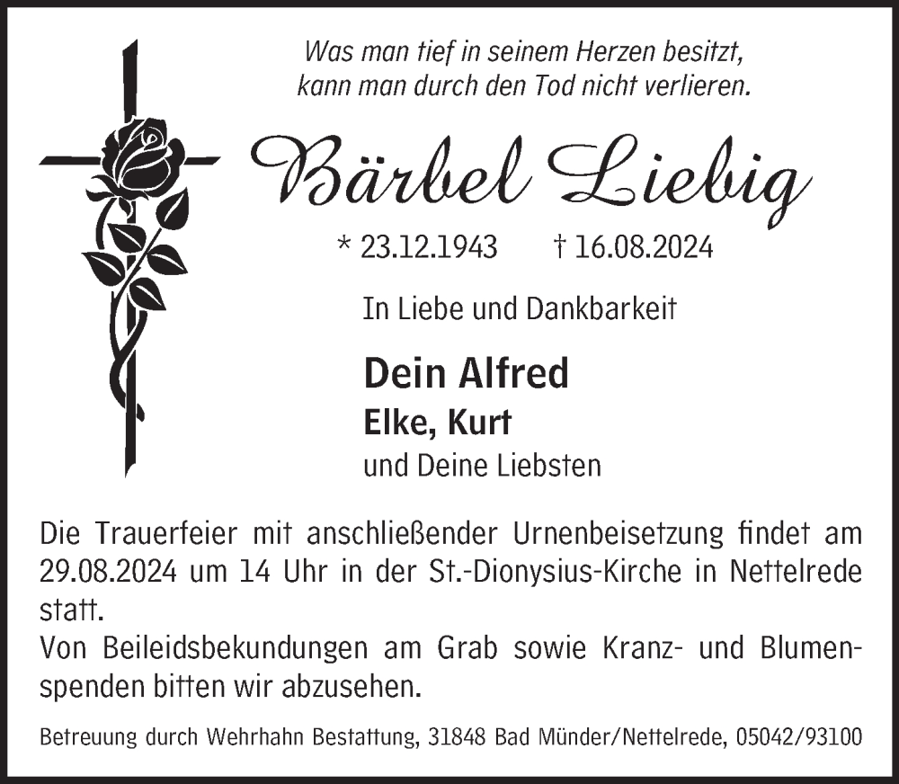 Hier finden Sie alle Traueranzeigen aus der Zeitung, die bisher für Bärbel Liebig erschienen sind. Weitere Traueranzeigen, die in der Zeitung erscheinen, werden hier ebenfalls aufgelistet