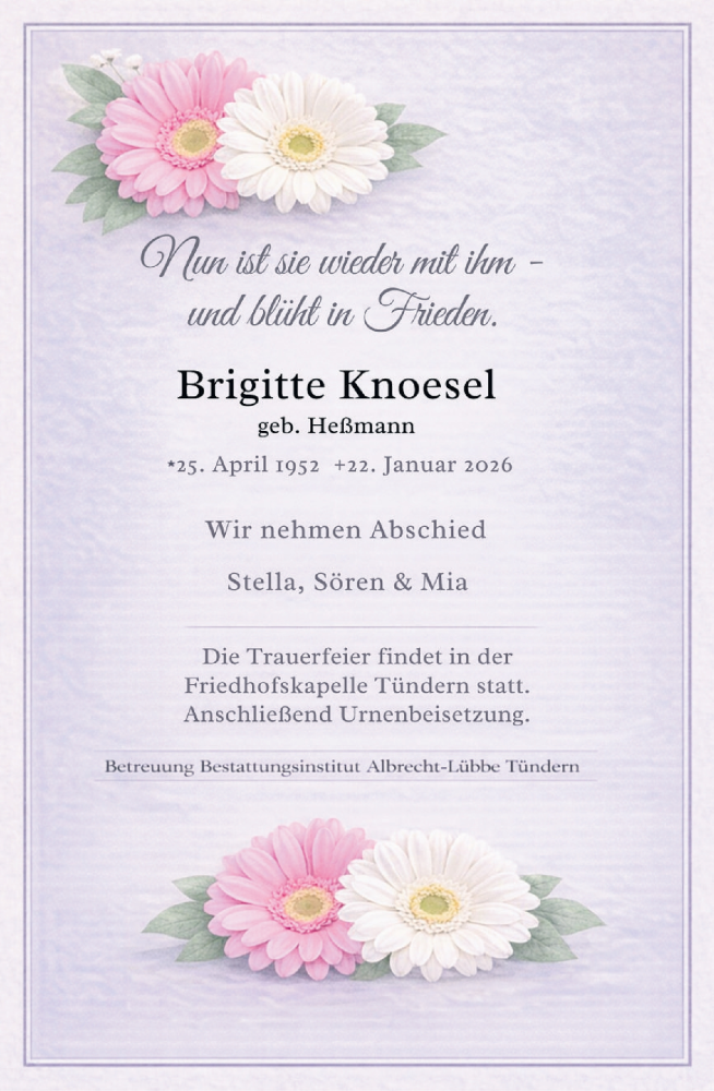Hier finden Sie alle Traueranzeigen aus der Zeitung, die bisher für Brigitte Knoesel erschienen sind. Weitere Traueranzeigen, die in der Zeitung erscheinen, werden hier ebenfalls aufgelistet