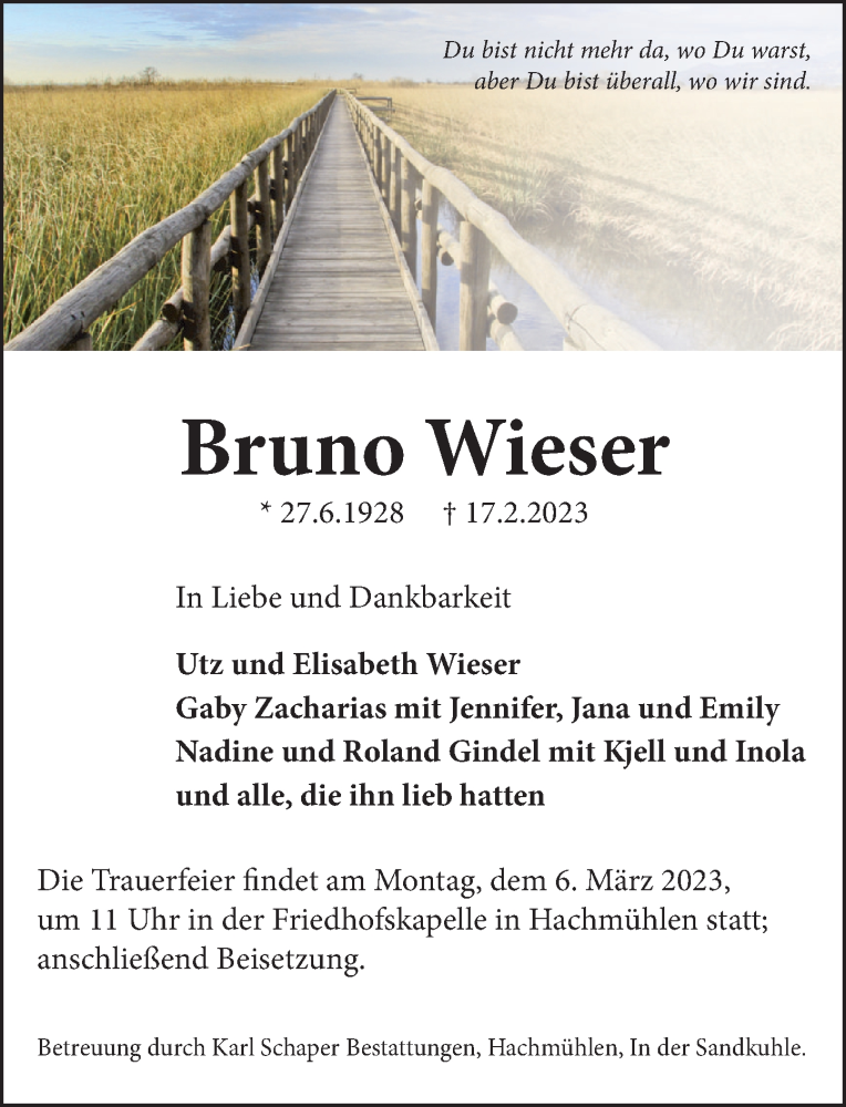 Hier finden Sie alle Traueranzeigen aus der Zeitung, die bisher für Bruno Wieser erschienen sind. Weitere Traueranzeigen, die in der Zeitung erscheinen, werden hier ebenfalls aufgelistet