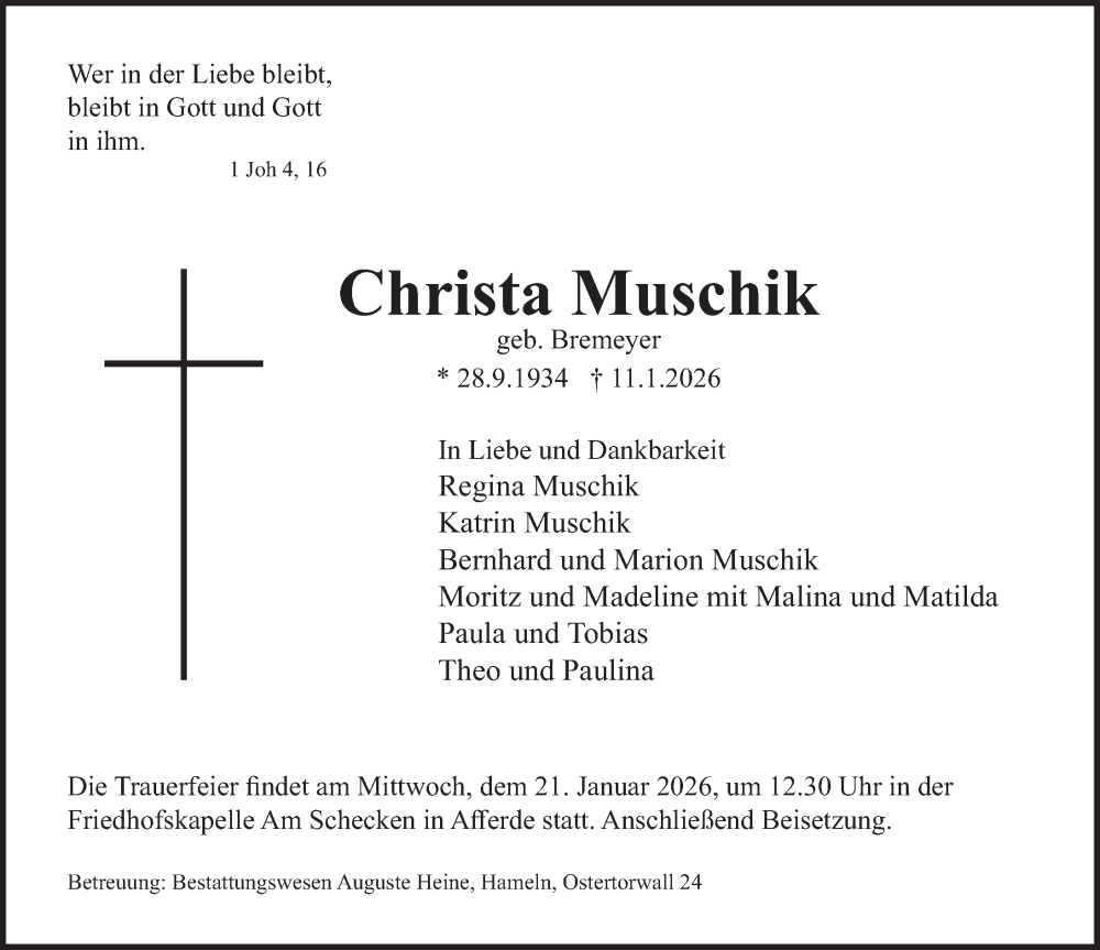 Hier finden Sie alle Traueranzeigen aus der Zeitung, die bisher für Christa Muschik erschienen sind. Weitere Traueranzeigen, die in der Zeitung erscheinen, werden hier ebenfalls aufgelistet