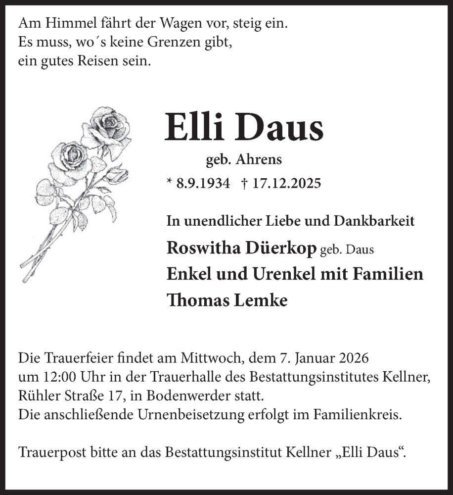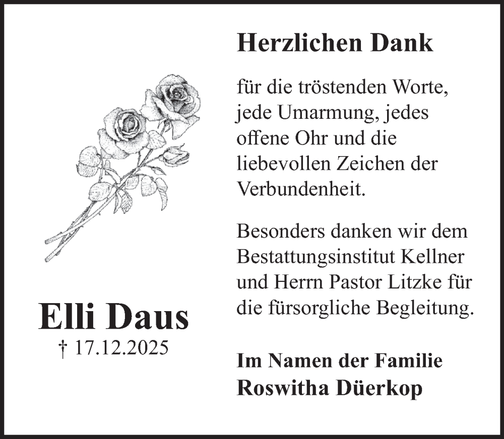 Hier finden Sie alle Traueranzeigen aus der Zeitung, die bisher für Elli Daus erschienen sind. Weitere Traueranzeigen, die in der Zeitung erscheinen, werden hier ebenfalls aufgelistet