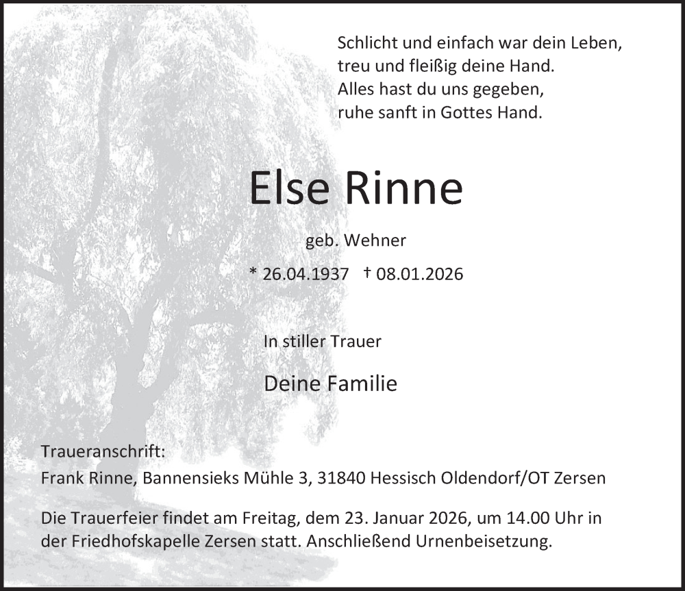 Hier finden Sie alle Traueranzeigen aus der Zeitung, die bisher für Else Rinne erschienen sind. Weitere Traueranzeigen, die in der Zeitung erscheinen, werden hier ebenfalls aufgelistet