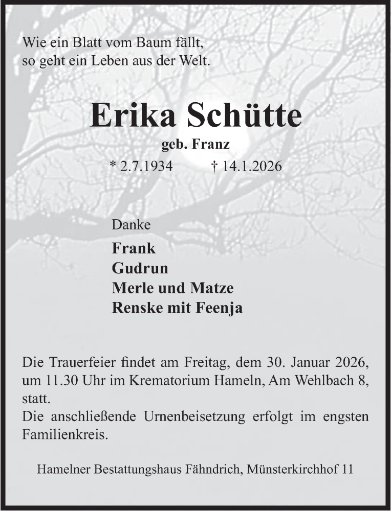 Hier finden Sie alle Traueranzeigen aus der Zeitung, die bisher für Erika Schütte erschienen sind. Weitere Traueranzeigen, die in der Zeitung erscheinen, werden hier ebenfalls aufgelistet