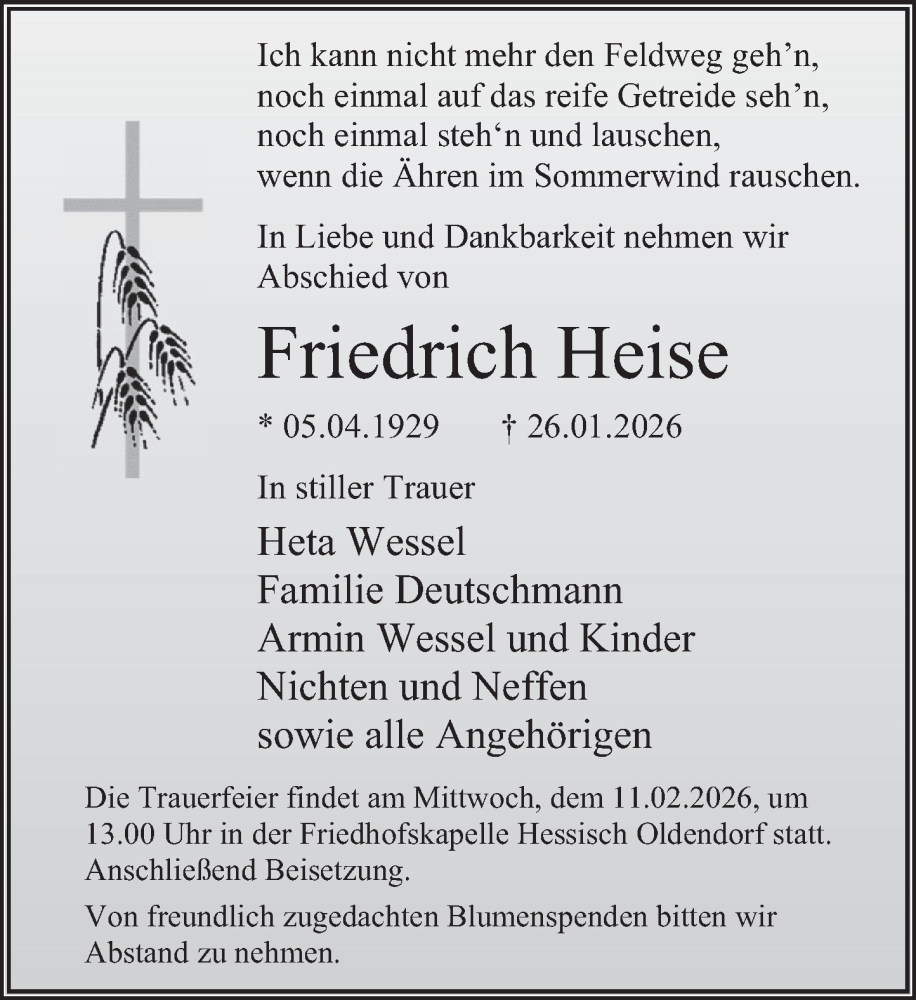 Hier finden Sie alle Traueranzeigen aus der Zeitung, die bisher für Friedrich Heise erschienen sind. Weitere Traueranzeigen, die in der Zeitung erscheinen, werden hier ebenfalls aufgelistet