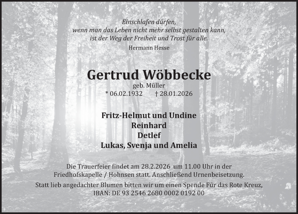 Hier finden Sie alle Traueranzeigen aus der Zeitung, die bisher für Gertrud Wöbbecke erschienen sind. Weitere Traueranzeigen, die in der Zeitung erscheinen, werden hier ebenfalls aufgelistet