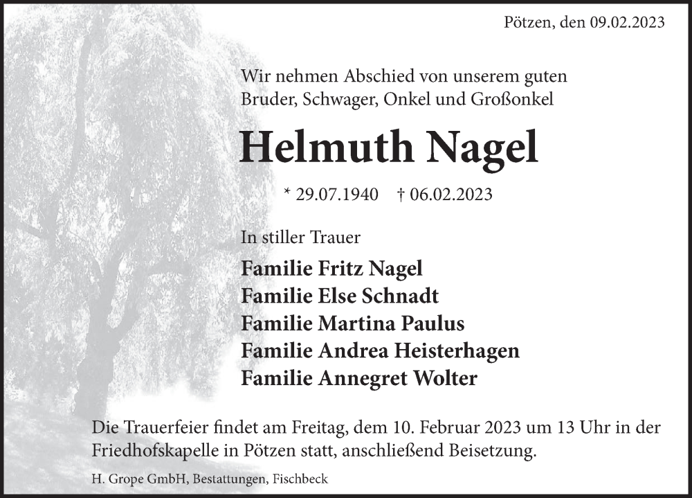 Hier finden Sie alle Traueranzeigen aus der Zeitung, die bisher für Helmuth Nagel erschienen sind. Weitere Traueranzeigen, die in der Zeitung erscheinen, werden hier ebenfalls aufgelistet