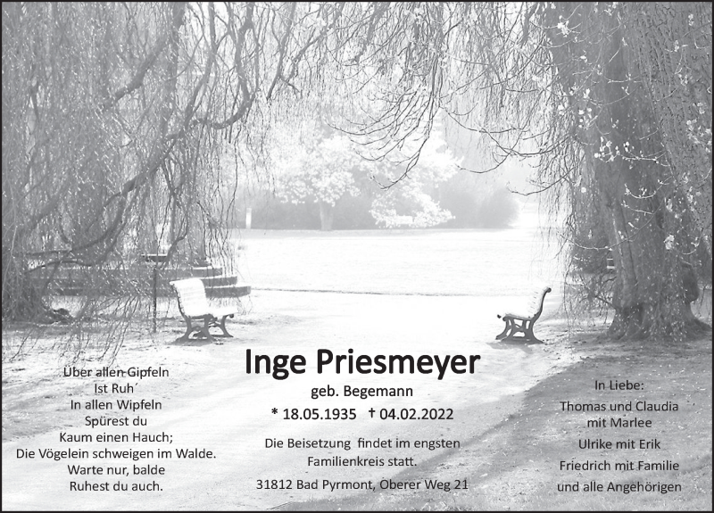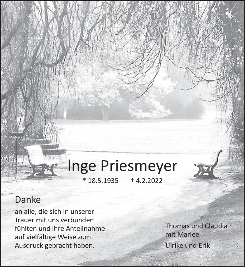 Hier finden Sie alle Traueranzeigen aus der Zeitung, die bisher für Inge Priesmeyer erschienen sind. Weitere Traueranzeigen, die in der Zeitung erscheinen, werden hier ebenfalls aufgelistet