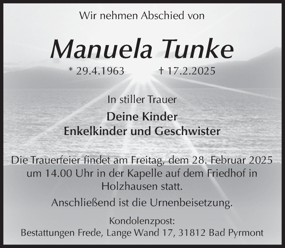 Hier finden Sie alle Traueranzeigen aus der Zeitung, die bisher für Manuela Tunke erschienen sind. Weitere Traueranzeigen, die in der Zeitung erscheinen, werden hier ebenfalls aufgelistet