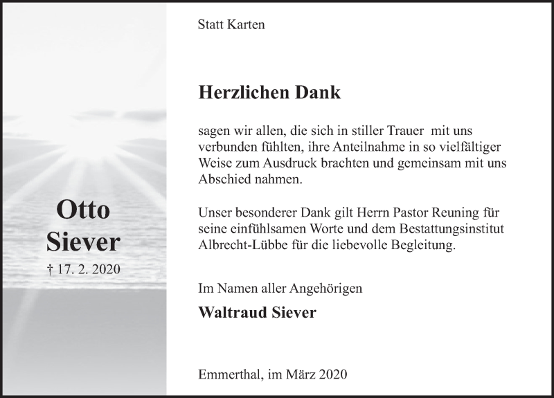 Hier finden Sie alle Traueranzeigen aus der Zeitung, die bisher für Otto Siever erschienen sind. Weitere Traueranzeigen, die in der Zeitung erscheinen, werden hier ebenfalls aufgelistet