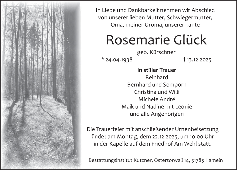 Hier finden Sie alle Traueranzeigen aus der Zeitung, die bisher für Rosemarie Glück erschienen sind. Weitere Traueranzeigen, die in der Zeitung erscheinen, werden hier ebenfalls aufgelistet