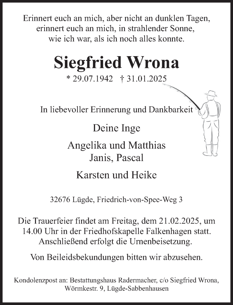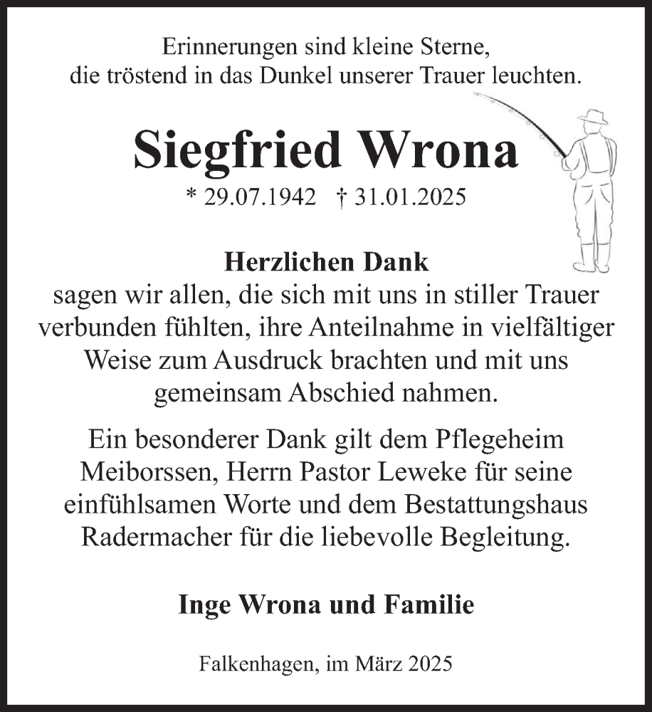 Hier finden Sie alle Traueranzeigen aus der Zeitung, die bisher für Siegfried Wrona erschienen sind. Weitere Traueranzeigen, die in der Zeitung erscheinen, werden hier ebenfalls aufgelistet