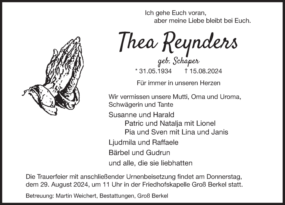 Hier finden Sie alle Traueranzeigen aus der Zeitung, die bisher für Thea Reynders erschienen sind. Weitere Traueranzeigen, die in der Zeitung erscheinen, werden hier ebenfalls aufgelistet