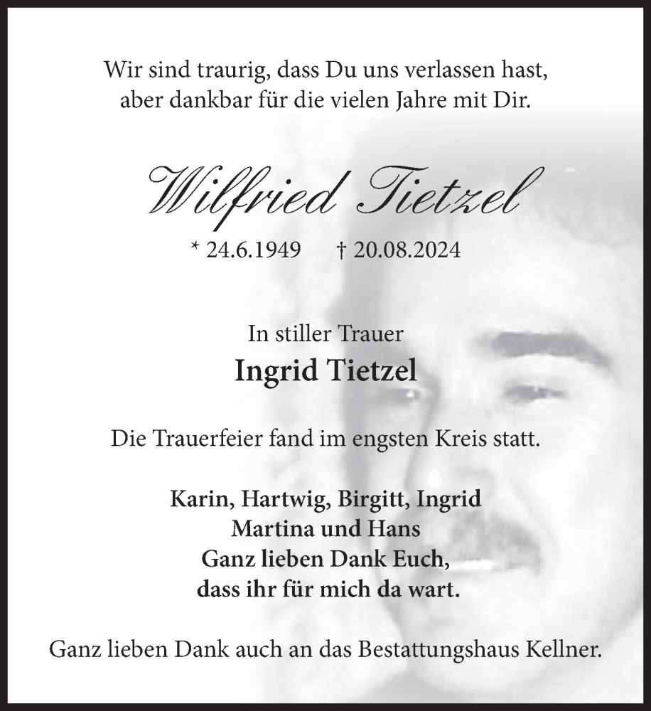 Hier finden Sie alle Traueranzeigen aus der Zeitung, die bisher für Wilfried Tietzel erschienen sind. Weitere Traueranzeigen, die in der Zeitung erscheinen, werden hier ebenfalls aufgelistet